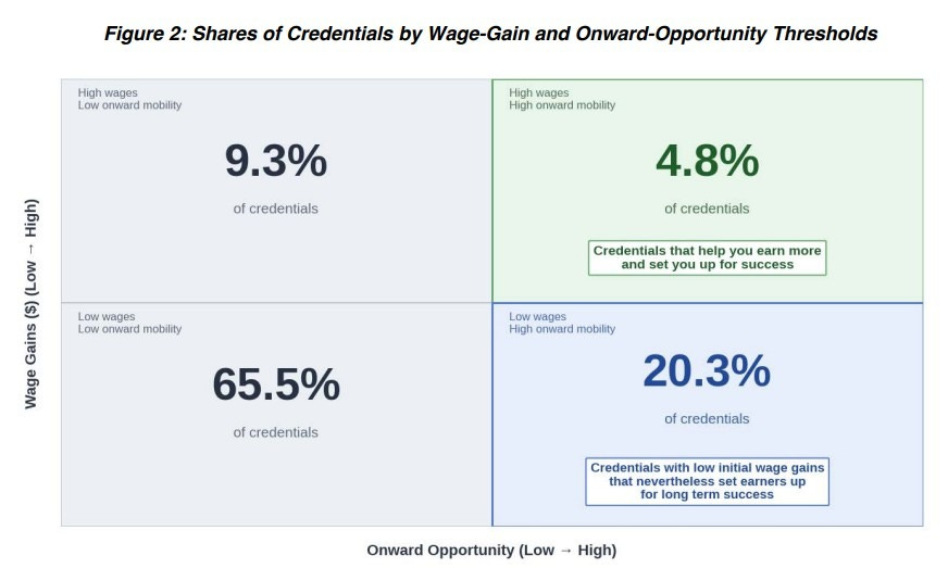 Burning Glass accepts the accountability impulse but complicates the metric. It argues that wage-only evaluation produces a systematic blind spot because career pivots often require lateral moves or a temporary step back before gains show up. It demonstrates that some credentials function as launchpads into higher-mobility pathways rather than immediate wage maximizers. That critique does not reverse the portfolio shift but gives some nuance to what counts as valuable.