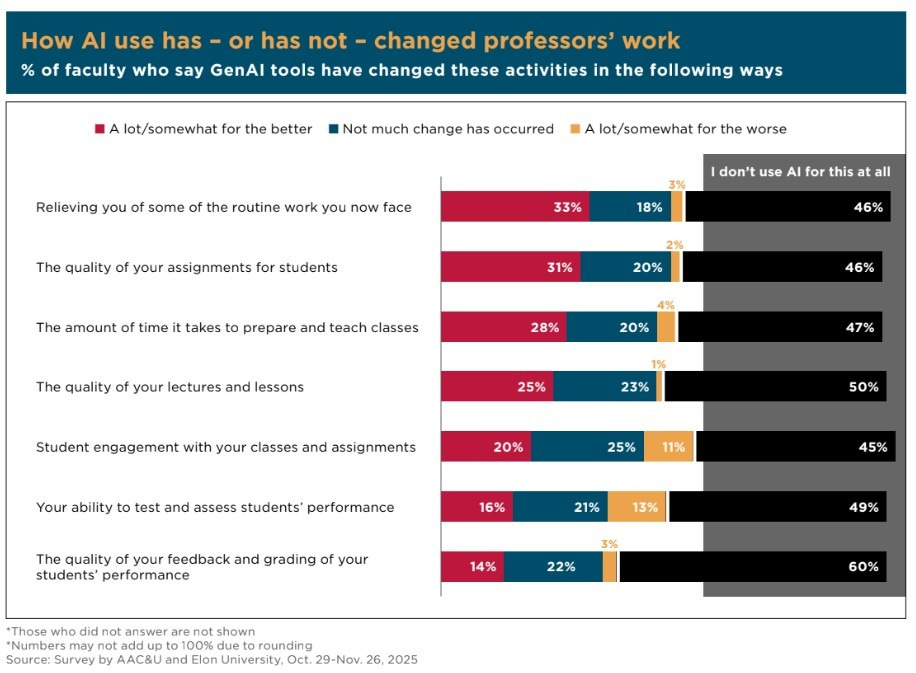 The AI Challenge: How College Faculty Assess the Present and Future of Higher Education in the Age of AI from American Association of Colleges and Universities and Elon University (January 21, 2026) reports on a survey of 1,057 U.S. college faculty to assess how they perceive AI’s impact. Faculty view generative AI as a net risk to student learning and institutional integrity, despite acknowledging limited instructional benefits. The report frames AI as a systemic pressure on teaching, assessment, credentialing, and the definition of learning.