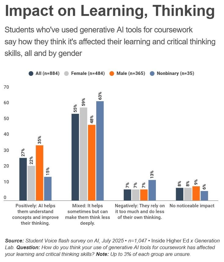 Recent surveys of college students are harder to find at present. How AI Is Changing—Not ‘Killing’—College (August 29, 2025) reports on Inside Higher Ed’s July 2025 Student Voice survey of 1,047 students. It finds AI is widely used and reshaping learning behaviors but it has not reduced the perceived value of college. Students report mixed effects on critical thinking and call for institutional guidance focused on ethical use rather than enforcement. We supplemented our analysis below with two older sources: 1.) Student Research Into How Students and Faculty Use AI published in January 2026 by Every Learner Everywhere (which Robert wrote). It reports on work done by student interns in the 2024-25 academic year to survey their peers and faculty. At that early date AI was normalized for many students, and a key finding is that many students were thinking critically about the influence of AI on their academic development. 2.) Time for Class 2025: Empowering Educators, Engaging Students, Tyton Partners from Tyton Partners (June 11, 2025) surveyed current college students, along with administrators and instructors on a range of issues. Its core finding is that regarding most digital learning in higher ed including AI, policy clarity and data integration lag behind implementation.